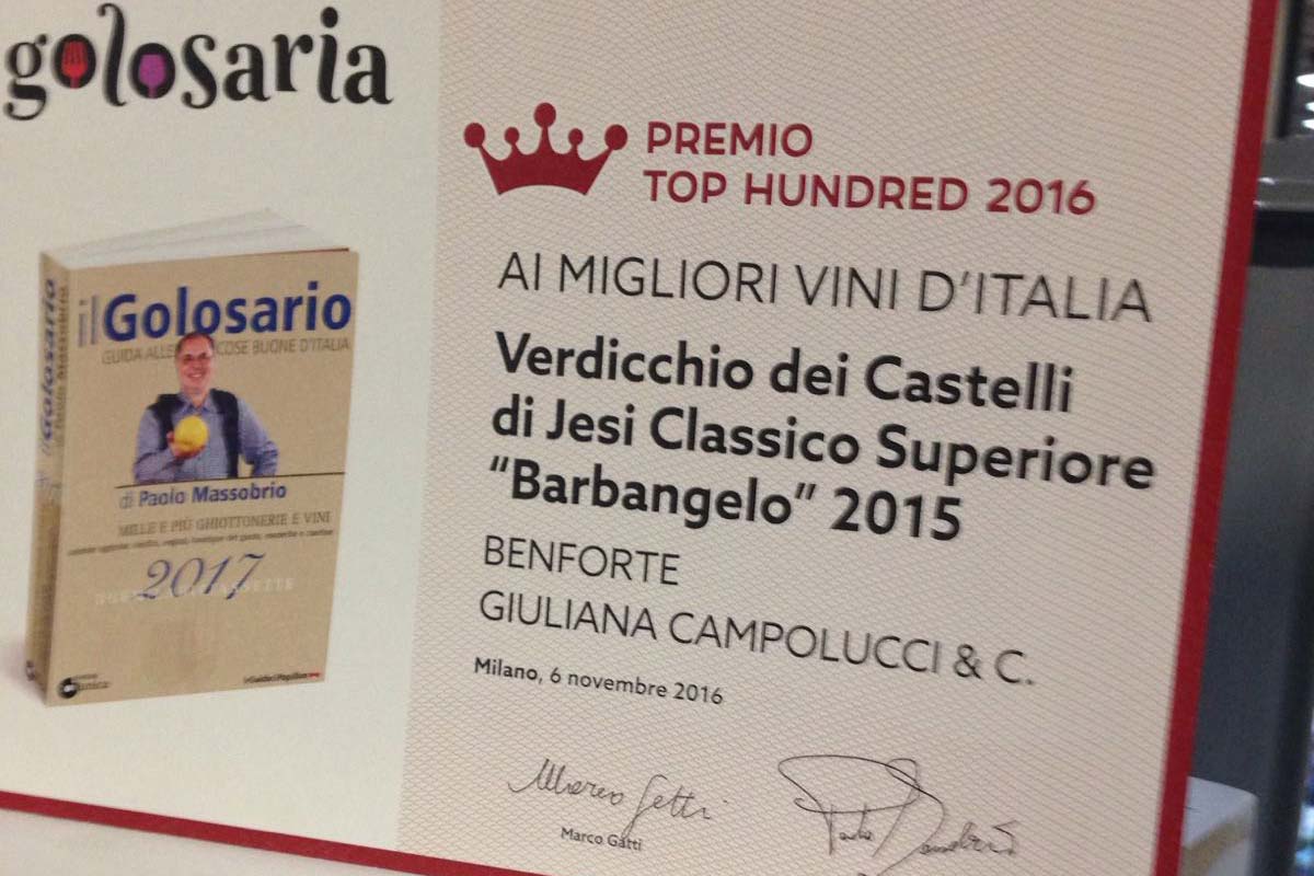 Il Barbangelo, Verdicchio dei castelli di Jesi classico superiore, annata 2015, è tra i Top Hundred 2016, premio che Golosaria riconosce ai 100 migliori vini italiani dell’anno.